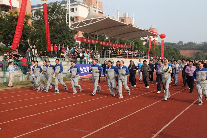 (本网讯)10月24日上午,我校第十届田径运动会在校本部第一田径场隆重开幕。校领导赵运林、李建华、龚卫明、孟昭武、汤放华、丁亮中、郑卫民、杨斌、刘辉煌、范志超、曹太康以及各机关处室、二级学院师生2000余人出席,孟昭武主持开幕式。
