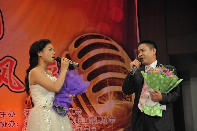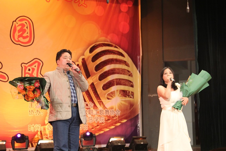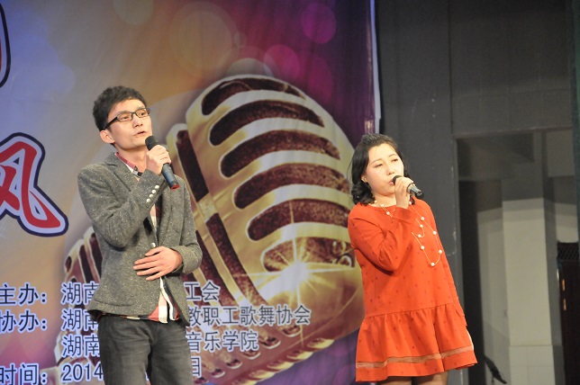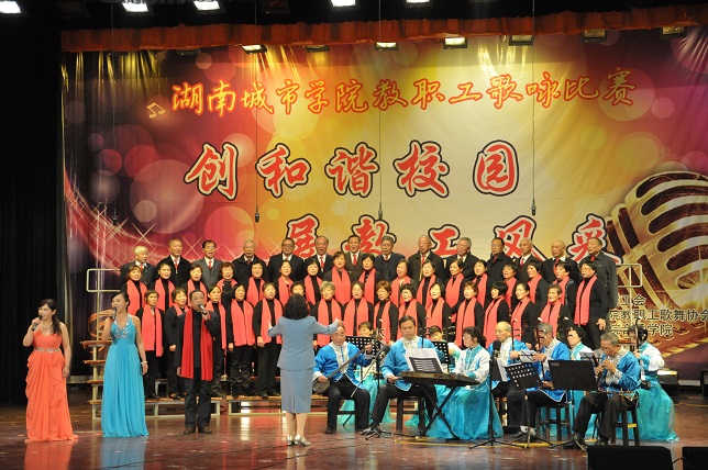 (本网讯)“创和谐校园、展教工风采”, 1125日晚7点,随着离退休教师们的《湖南民歌联唱》盛装开场,由校工会主办,教职工歌舞协会、音乐学院协办的教职工歌咏比赛在音乐学院音乐厅拉开帷幕。各分工会精心组织节目,参赛选手们盛装打扮,倾情演出,或深情悠扬,或高亢激昂,动听的歌声不时引起现场观众如雷般的掌声。