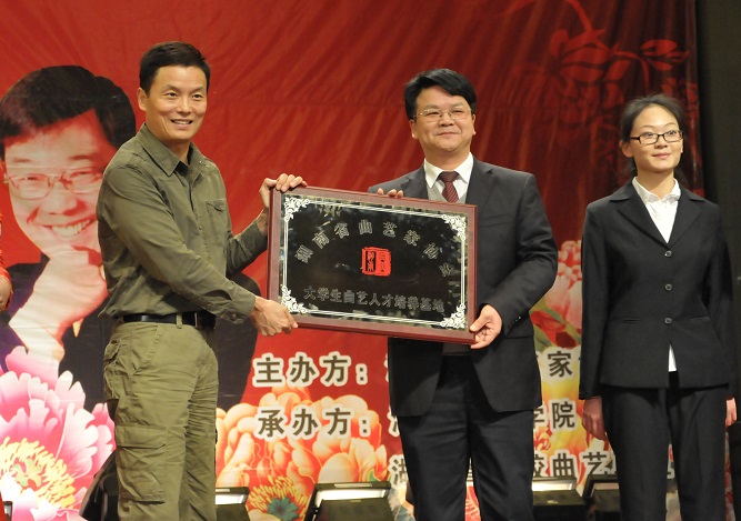周卫星在湖南省曲艺家协会向众博官方网址授予“大学生曲艺人才培养基地”的仪式上说:“我们希望能发现优秀曲艺人才,认真合作,着力培养,为发展湖南曲艺事业,弘扬优秀传统文化做出贡献。”汤放华和学生代表马丹丹等代表学校接受牌匾,我校由此开始成为了省曲协的人才培养基地。