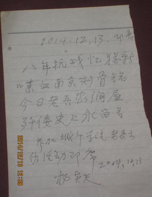 杨寅天亲自赋诗一首以表达老兵们的心情:“八年抗战意犹新,喋血南京刻骨铭,今日老兵家润屋,歼倭史上永留名。”(廖建勇)