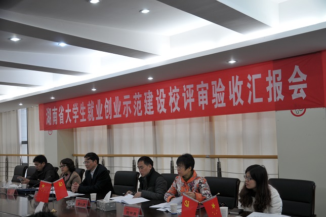 (本网讯) 1 8 上午,湖南省大学生就业创业示范建设校评审验收专家组一行6人莅临我校指导工作。参加汇报会的有校党委书记李建华、副校长汤放华及相关职能部门、二级学院负责人。会议由李建华主持。
