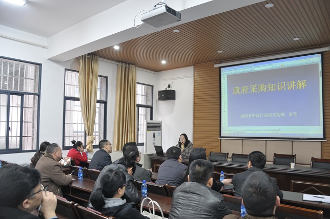 (本网讯)320日下午,学校在二办公楼三楼会议室举办政府采购知识专题讲座,特邀湖南省财政厅政府采购处副调研员、高级会计师黄莹讲学。学校招投标委员会成员,二级学院院长、分管资产的副院长、资产管理员,纪委监察处、审计处、计财处、资产处、招投标办公室的全体工作人员,以及各机关处室资产管理员参加。副校长严曙光主持讲座活动。