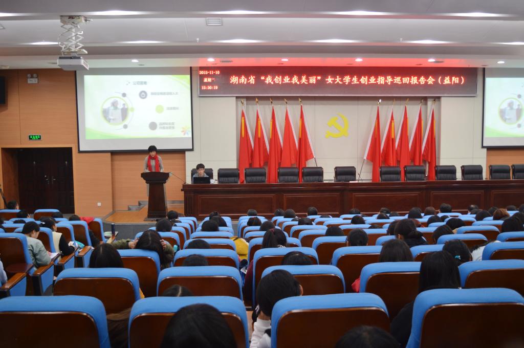 (本网迅)为鼓励女大学生积极投身创新创业热潮,促进全社会形成关心支持女大学生创新创业的良好氛围。1110日下午,由省妇联、省教育厅联合主办的“我创业我美丽”女大学生创业指导巡回报告会在我校图书馆报告厅举行。五位成功创业的女企业家应邀来校演讲。省妇联副主席鲁华、省妇联事业发展部部长陈敏、省教育厅学生处处长熊俊钧、省妇联事业发展部副部长黄兰香、益阳市人民政府副市长李激扬、益阳市妇联主席杨丽萍、我校副校长汤放华出席报告会,300多名有创业意向的女大学生聆听了报告会。