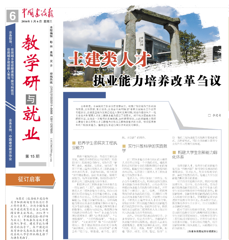 (本网讯) 16,校长 李建奇 教授在《中国建设报》发表了题为“土建类人才执业能力培养改革刍议”的署名文章。文章结合中央城市工作会议精神,对建筑类高校培养学生多层次工程执业能力进行了解读。