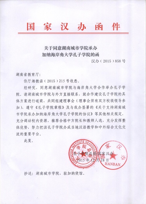 (本网讯)日前,国家汉办向我校正式发函(《关于同意众博官方网址承办加纳海岸角大学孔子学院的函》汉办〔2015〕858号),同意我校与加纳海岸角大学合作建设孔子学院。我校成为全省二本院校第一所建有孔子学院的高校。