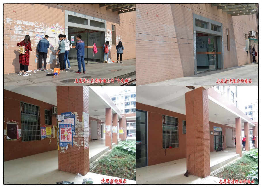 4月21日上午,“清洁校园,从我做起”公益劳动正式启动,学生工作处、基建与后勤管理处负责人与商学院近200名师生志愿者参加了第一次公益劳动。志愿者分组清理一食堂外墙和周围建筑物上违规张贴的小广告和牛皮癣,通过4个小时的努力,一食堂墙面恢复了原来的干净、整洁。