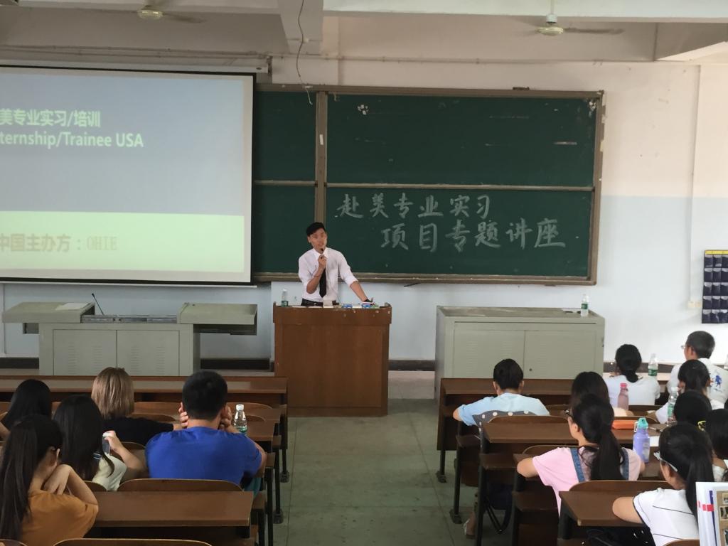 (本网讯)继建立省级校企合作人才培养示范基地之后,商学院继续发力专业内涵建设,进一步拓展人才培养模式,立足专业优势,瞄准海外市场,为学生打造专业实习的国际化平台。2016年9月27日下午,该院邀请了中国对外友好合作服务中心负责人邹虎主任一行来校举办“赴美实习项目”专场讲座。2013、2014级旅游管理专业全体学生和旅管教研室部分教师参加专题讲座。