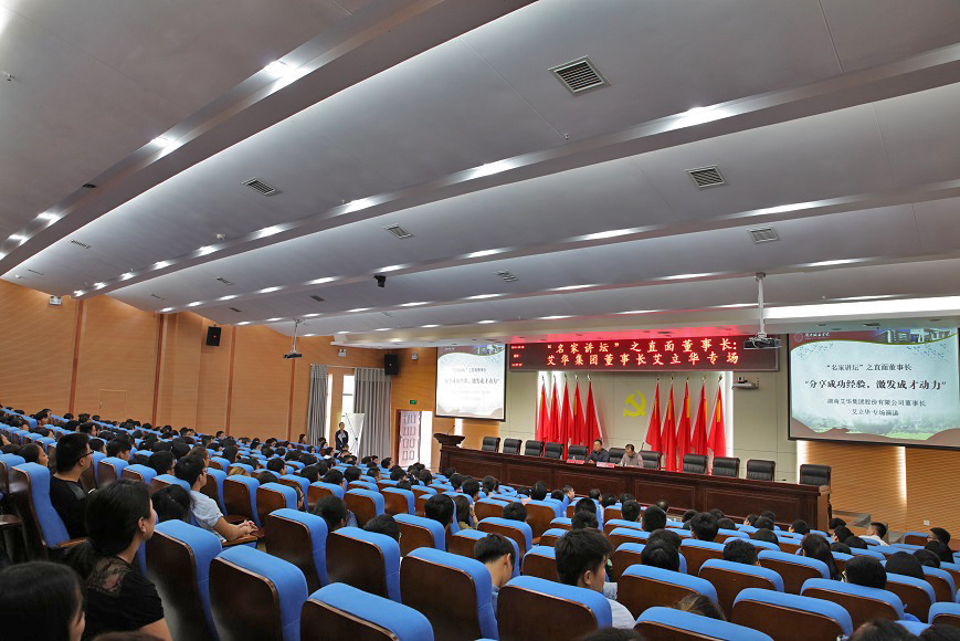 (本网讯)10月18日下午,湖南艾华集团股份有限公司董事长艾立华在图书馆报告厅为我校400余名师生作了题为“分享成功经验,激发成才动力”的专题演讲。校领导罗成翼、李建奇、汤放华、姚春梅、郑卫民、刘辉煌、何振、雷存喜、谭献良、范志超以及艾华集团总经理王安安、副总裁艾燕、经理陈晨、总监贾明、团委书记曹彩虹出席演讲会。