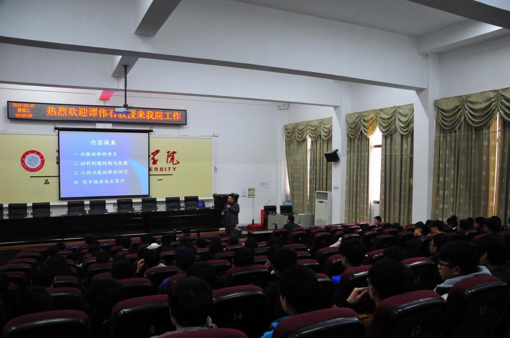 (本网讯)为实现学校转型发展和加强“双一流”建设,学校进一步加大了高层次人才引进力度。3月7日下午,我校新引进教授、博士生导师、学科带头人谭伟石在电信楼视频会议室作了一场题为“几种功能材料的微结构、性能及同步辐射技术”的学术讲座,纪委书记姚春梅教授、人事处相关负责人,信息与电子工程学院全体教师、光电工程和物理专业学生听取了讲座。