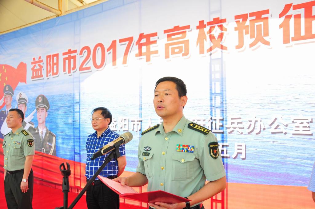 (本网讯)5月16日下午,益阳市2017年高校预征启动仪式在我校田径场隆重举行。益阳市征兵办公室主任、军分区参谋长盛全大校,市政府副秘书长杨光辉,我校副校长谭献良,湖南工艺美术职业学院副校长汪泳波,益阳医学高等专科学校副校长范珍明,益阳职业技术学院副校长潘访华,以及资阳区、赫山区人武部、各高校领导同志、老师、1000多名各高校学生代表参加了启动仪式。启动仪式由赫山区人武部部长张永发主持。