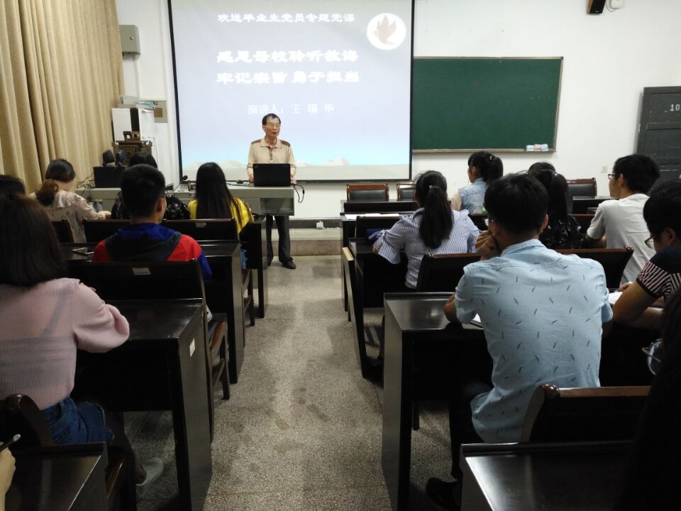 (本网讯)为积极配合学校纪委组织开展的廉洁文化活动月活动,让毕业生党员过上最后一次党内组织生活,感恩母校、铭记宗旨、勇于担当,强化党员身份意识,在各自新的工作岗位和人生征程中遵循《党章》规范, 5月24日晚,理学院邀请原数计院退休老教师王锡华在3教学楼108教室,为该院毕业生党员上了一堂题为“铭记宗旨,勇于担当”的廉政党课。