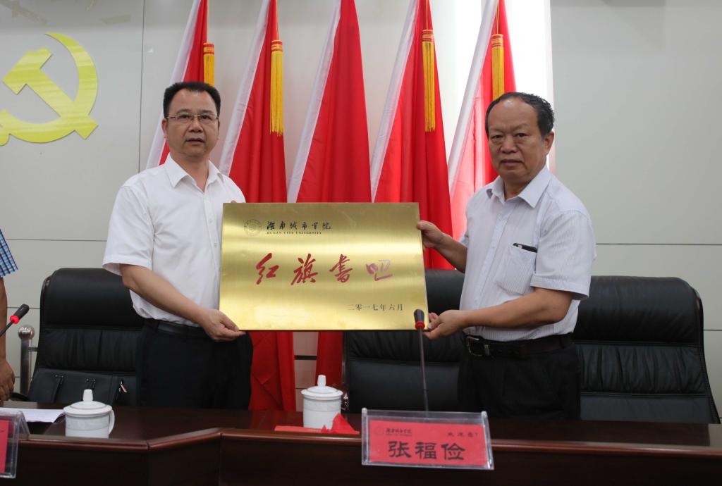 张福俭向我校授予“红旗出版社中国特色社会主义体系(益阳)研究中心”、“红旗书吧”牌匾,党委书记罗成翼和校长李建奇代表学校接牌。随后,张福俭向我校赠送以“学习习近平总书记系列重要讲话,为实现中华民族伟大复兴中国梦而奋斗”为主题的精品图书,李建奇代表学校向红旗出版社颁发捐赠证书,并聘任邹树梁教授为我校兼职教授。
