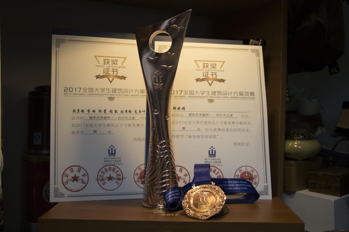 (本网讯)近日,2017全国大学生建筑设计方案竞赛成绩揭晓,我校建筑与城市规划学院师生在本次建筑设计竞赛中取得佳绩。建筑学专业四年级学生段彦超、李璐、杨蒙、张凯、刘瑾瑜、龙舟叶提交的设计作品《城市共享插件——自行车之家》获得铜奖,韩晓娟老师获得最佳指导老师奖,在同省参赛高校中名列前茅。获奖作品在第九届中国威海国际人居节上展出。