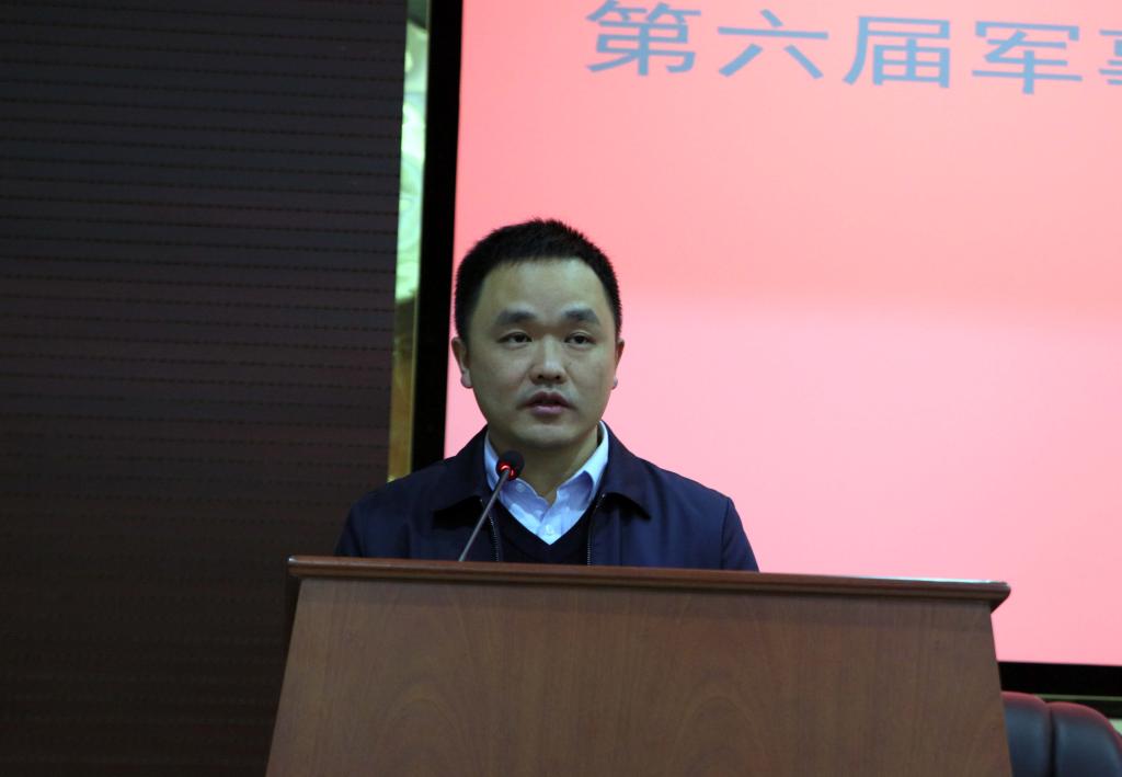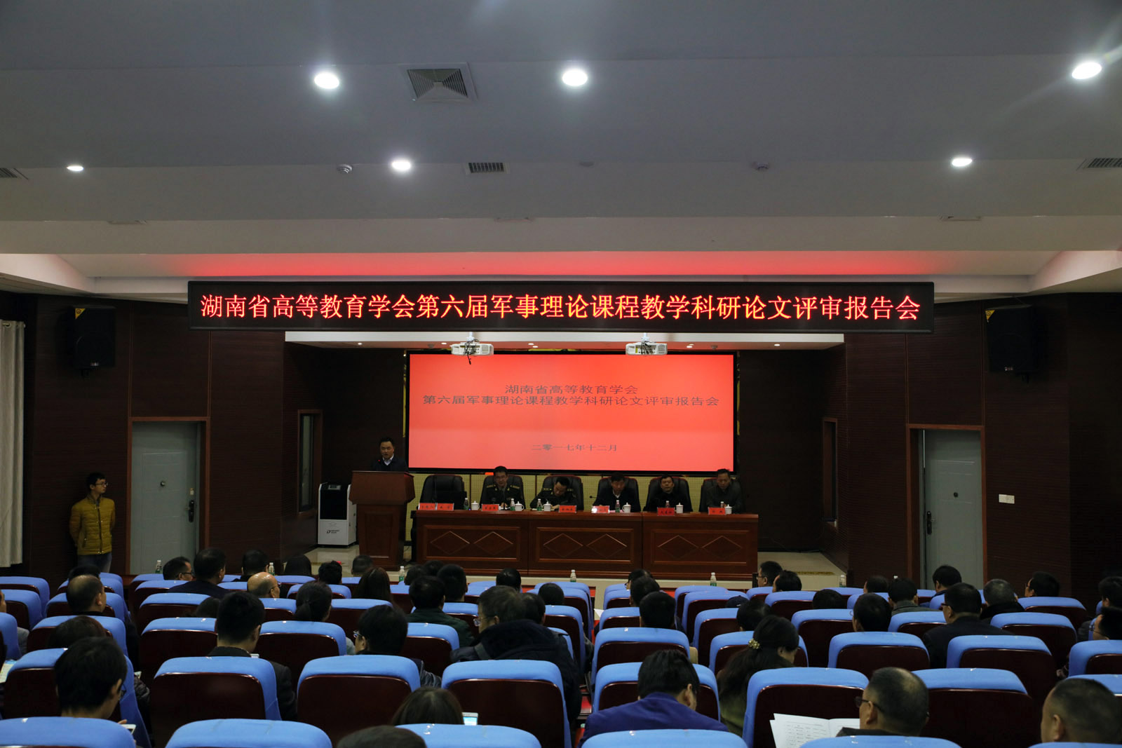(本网讯)12月22日,湖南省第六届高校军事理论课程教学科研论文评审报告会暨高等教育学会第九届国防教育专业委员会2017年年会在我校建规楼121学术报告厅隆重举行。国防科技大学大校李正军教授、湖南省学生军训办公室专职副主任余旭东、湖南省教育厅体卫艺处主任科员王宇、湖南省教育厅体卫艺处原正处级调研员文麦秋,副校长谭献良出席开幕式。各高校武装部负责人及会员单位120余人出席会议。