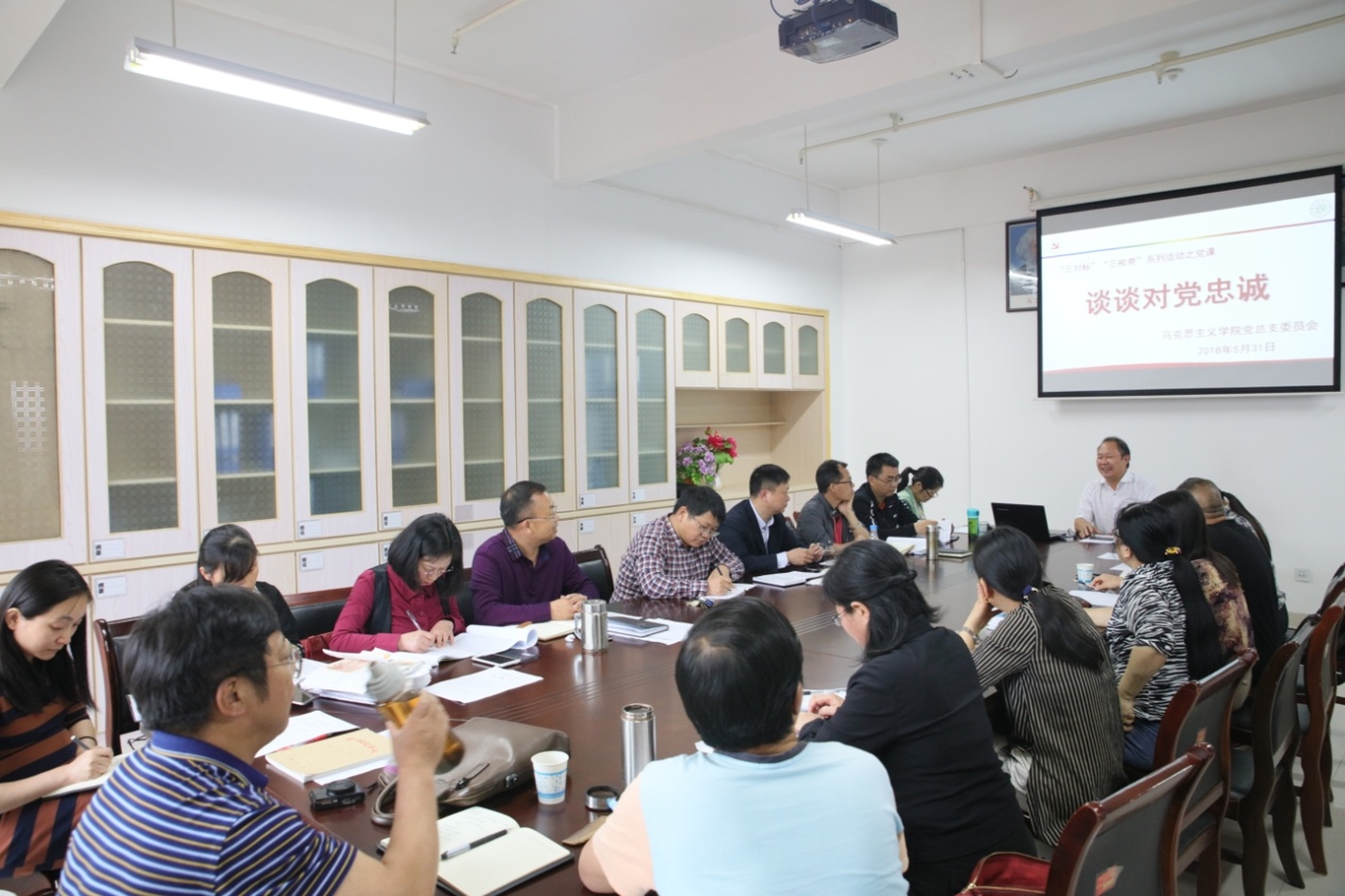 5月31日下午,马克思主义学院党总支组织全体党员及学院非党员教师听主题党课:谈谈对党忠诚。主题党课由学院党总支委员、教工第一党支部书记涂建华主讲涂建华从学理角度分析了忠诚的定义,阐明并回答了为什么要忠诚、为什么要对党忠诚等问题。学校党委书记罗成翼以普通党员身份参加听党课并作重要讲话。罗成翼认为,涂建华同志的党课准备充分、有思想,特别是今天的党课主题谈对党的忠诚很有必要,在过去一段时间党员意识有所弱化,个别党员谈对党忠诚还羞羞答答。罗成翼强调,党员干部要把忠诚化作实际行动,把个人利益与学校利益统一起来,带领大家努力干事创业。与会同志讨论时一致认为,作为党员,我们要对标看齐,要把对党忠诚落实在行动上,落实在推进学校审核评估工作中。