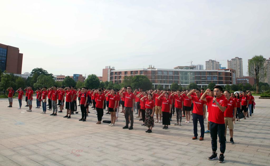 伴随着激昂的进行曲,罗成翼为即将出征的20支团队授旗,各团队学生队长依次接旗。