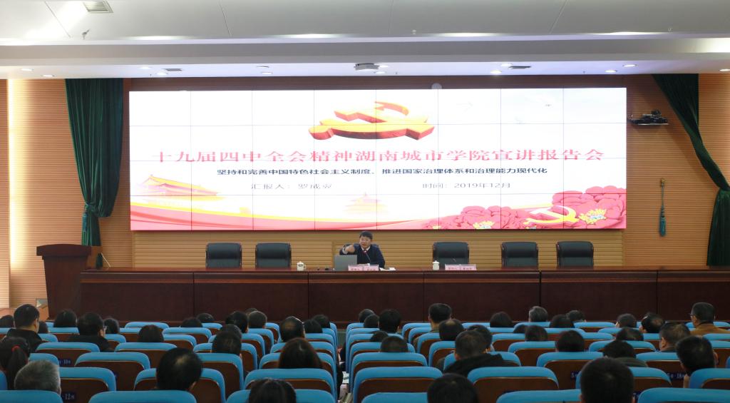 (本网讯)为深入学习宣讲《中共中央关于坚持和完善中国特色社会主义制度,推进国家治理体系和治理能力现代化若干重大问题的决定》(以下简称《决定》),深刻领会贯彻党的十九届四中全会精神,确保党和国家的重大决策部署按制度要求落到实处、见到实效,按照省委、省委教育工委部署要求,众博官方网址于12月4日上午在学校图书馆报告厅举行党的十九届四中全会精神宣讲报告会。党委书记罗成翼作宣讲报告。学校在家校领导,各二级党组织书记、副书记,机关党员,全体辅导员参加报告会。党委副书记、校长李建奇主持报告会。