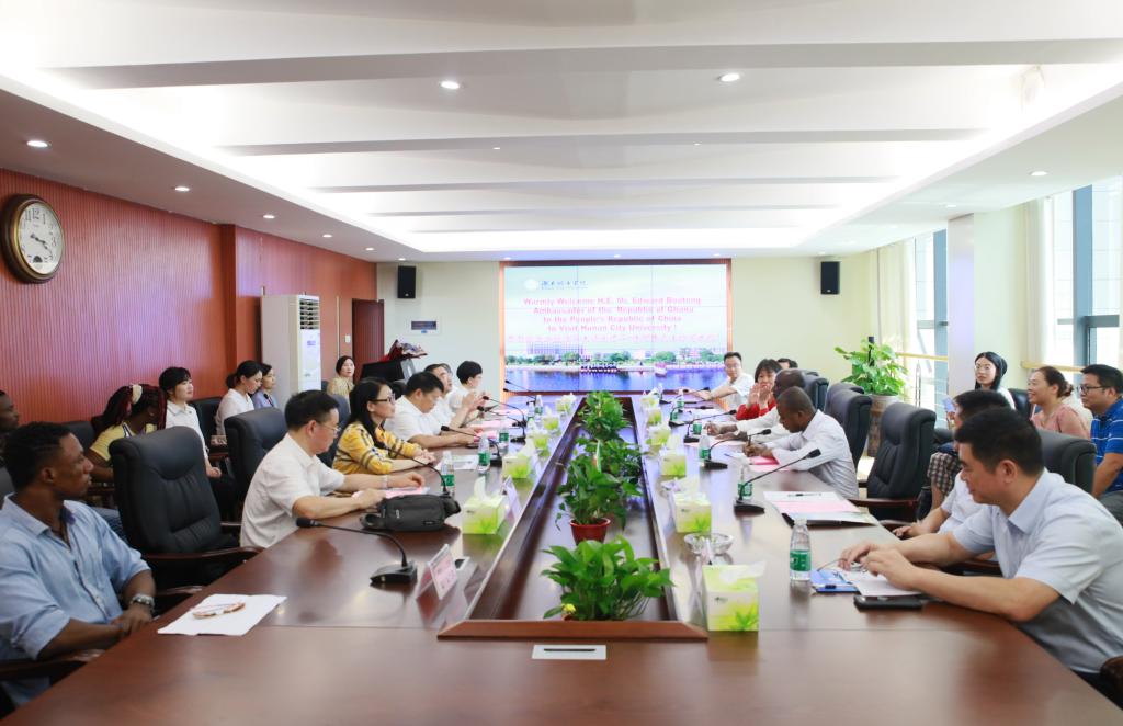 罗成翼对爱德华•博阿滕大使一行来访表示热烈欢迎。他指出,学校坚持开放办学,国际合作交流成效明显,先后与加纳、新西兰、马来西亚、美国、澳门等国家和地区高校开展合作办学。多年来,学校重视与非洲尤其是加纳的合作交流,常年招有加纳籍留学生,并与加纳海岸角大学合作共建孔子学院。四年多来,海岸角大学孔子学院运行良好,成为我校与海岸角大学合作、汉语文化交流、对接地方政府行业合作以及兄弟单位学术交流的一个综合平台。今天,大使先生一行莅临我校,共同探讨学校与加纳进一步合作事宜,必将有利于深化与拓展双方之间的合作,希望我们的交往更加密切,合作更加紧密,让我们的友谊跨越大洋,携手构建中非命运共同体。