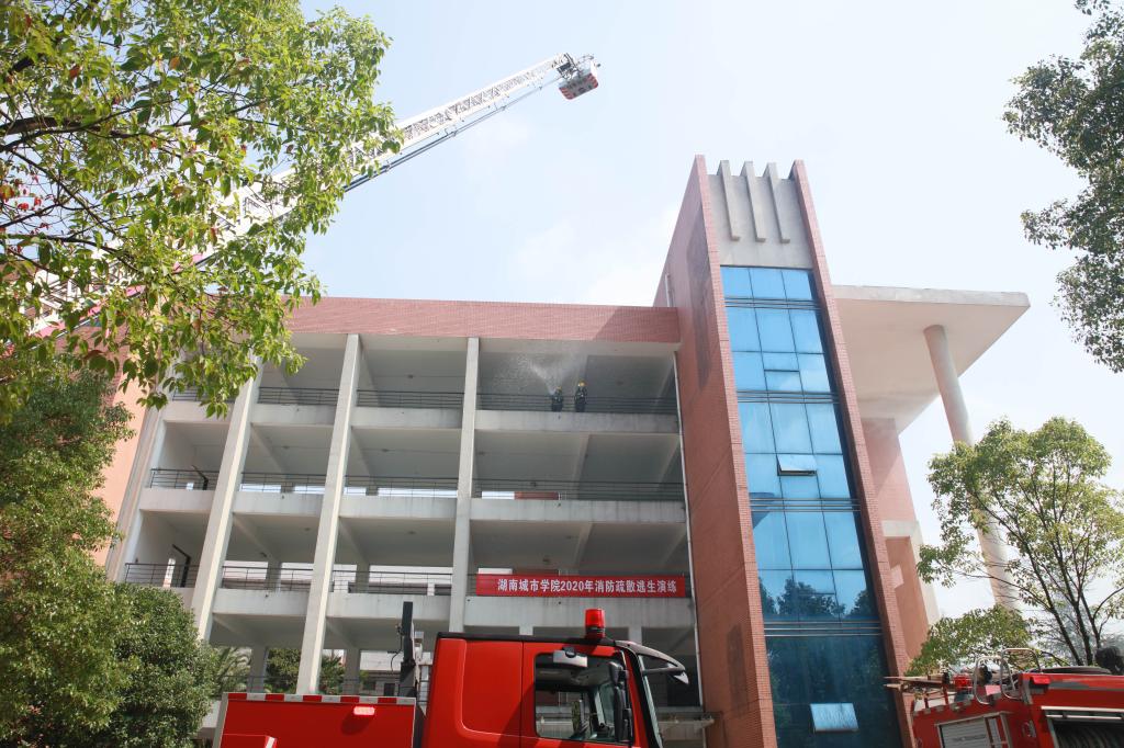 益阳消防救援支队使用消防登高车营救被困人员,利用水枪开展灭火作业。