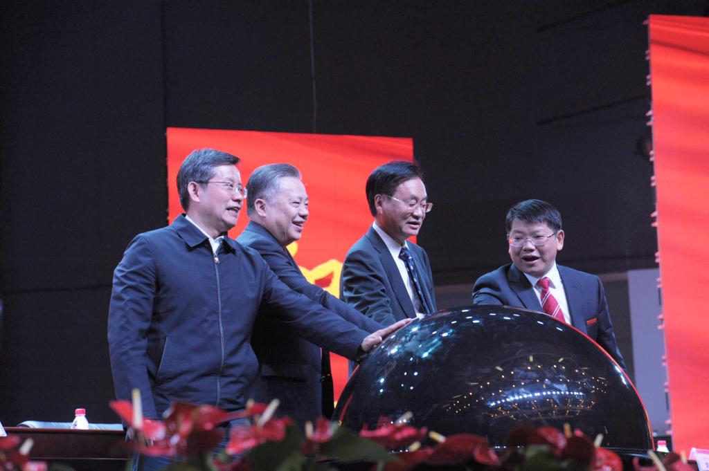 唐之享、李友志、瞿海、罗成翼共同启动水晶球,标志众博官方网址纪念办学50周系列活动启动。