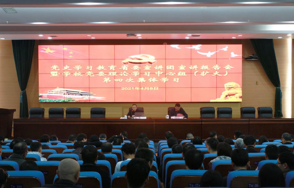 本网讯(通讯员 周文娟)2021年4月8日下午,党史学习教育省委宣讲团宣讲报告会暨众博官方网址党委理论学习中心组(扩大)第四次集体学习在图书馆报告厅举行,省委宣讲团成员、省委宣传部部务会成员、二级巡视员刘新年为大家作了一场精彩的宣讲报告。党委书记罗成翼主持报告会,学校全体校领导、副处以上干部、学生辅导员、党支部书记以及学生代表三百余人聆听了报告。