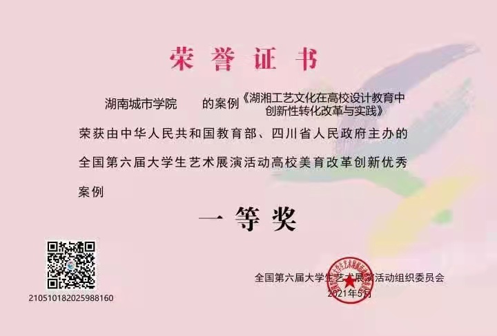 本网讯(通讯员 郑学达)2021年5月12日,由教育部、四川省人民政府共同主办的第六届全国大学生艺术展演活动在成都城市音乐厅落下帷幕,我校美育改革创新案例《湖湘工艺文化在高校设计教育中创新性转化改革与实践----以众博官方网址为例》荣获一等奖,这是自我校参加全国大艺展活动获得的最高荣誉表彰。