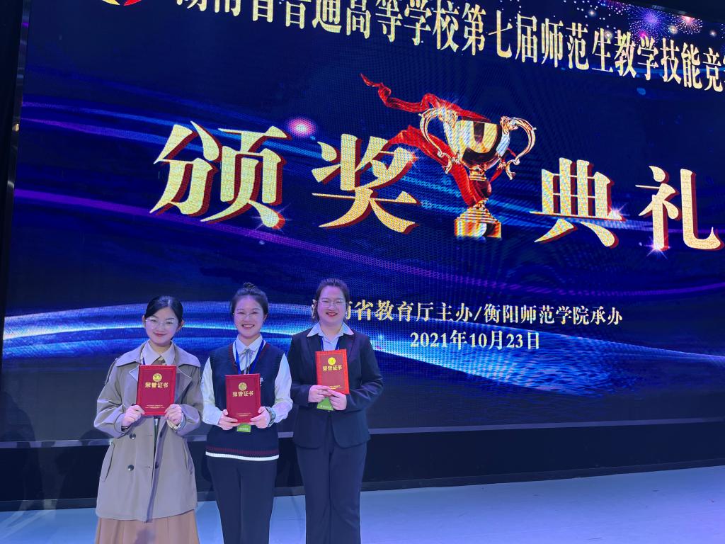 本网讯(通讯员 杨蕾)2021年10月23日,由省教育厅主办的湖南省普通高校第七届师范生教学技能竞赛在衡阳师范学院举行。经过激烈角逐,我校人文学院/大学英语教学部李诗音同学和梁慧玲同学分别获中学文科组一等奖和三等奖,理学院/教师教育学院谭晓玉同学获中学理科组三等奖。