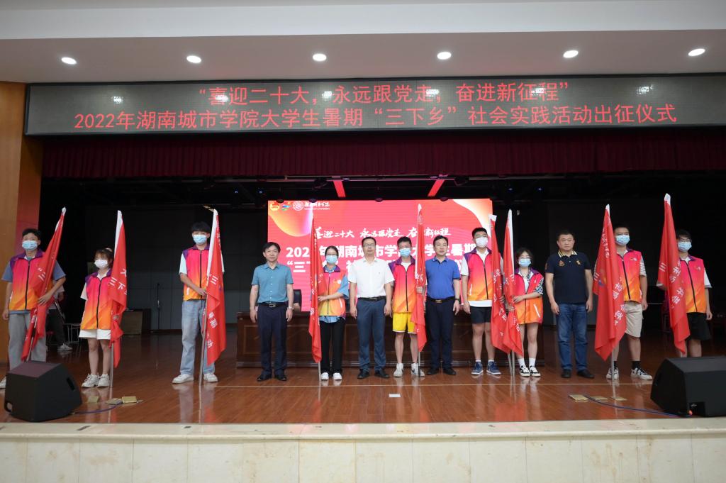 本网讯(通讯员 李琳)6月22日上午,我校在学生活动中心举行2022年“喜迎二十大,永远跟党走,奋进新征程”暑期“三下乡”社会实践活动出征仪式。副校长袁志成,党委宣传部、学生工作部、招生就业处相关负责人,各学院团委书记、各校级立项团队指导教师以及2022年暑期“三下乡”社会实践活动团队成员共计200余人参加了出征仪式。