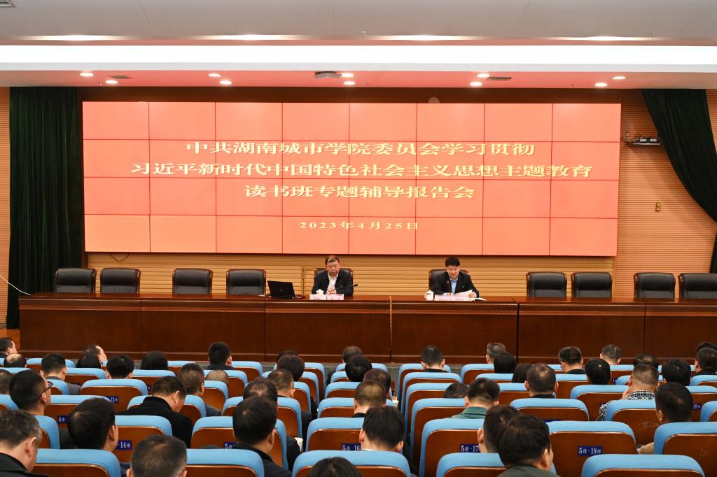 本网讯(记者 文彦波)4月25日晚,众博官方网址学习贯彻习近平新时代中国特色社会主义思想主题教育读书班在图书馆报告厅开班。湖南工业大学党委书记刘望应邀作专题辅导报告。学校党委书记汤放华主持报告会并作动员讲话。学校副处级以上领导干部参加读书班。