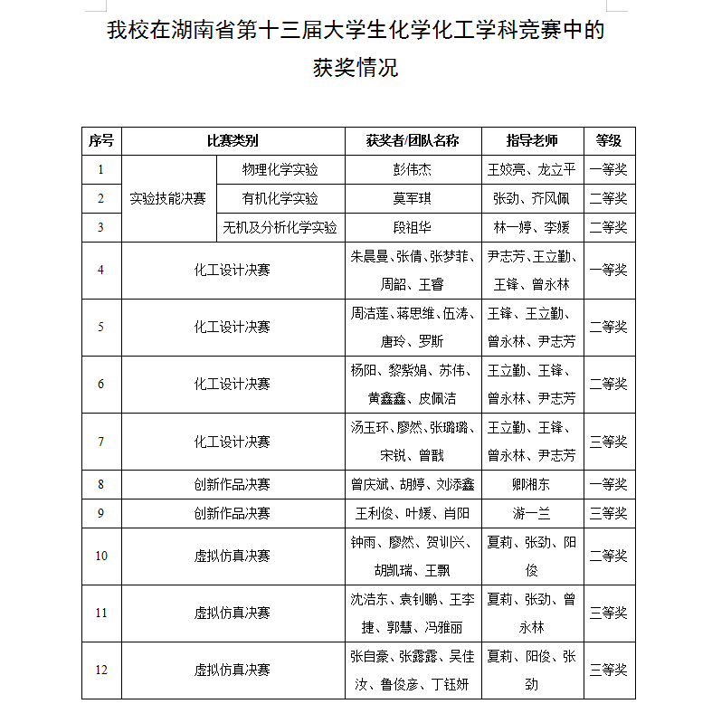 本网讯(通讯员 林一婷 张劲)2023年7月11日-13日,由湖南省教育厅主办,湖南科技学院承办的湖南省第十三届大学生化学化工学科竞赛暨湖南省高校化学化工实践教学与管理研讨会在永州举办。来自中南大学、湖南大学和湖南师范大学等28所高校共计600余名师生参加了比赛和研讨会,我校材料与化学工程学院共派出23名学生参赛,经过激烈角逐,共获得一等奖3项、二等奖5项、三等奖4项。
