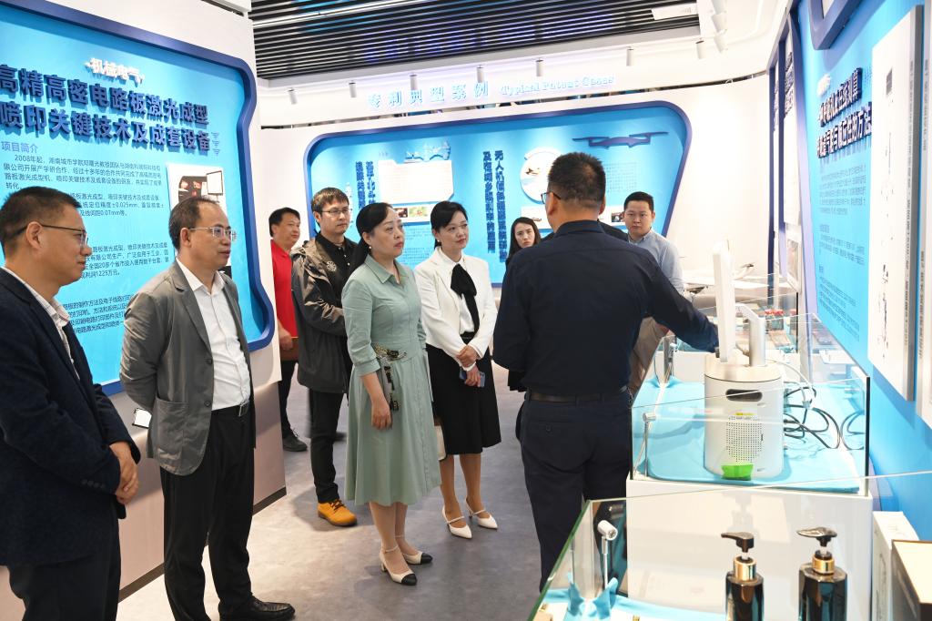 本网讯(通讯员 刘湛军)10月17日,湖南省市场监督管理局知识产权运用处处长何萍带队来我校调研知识产权中心建设工作。校长何振陪同参观学校知识产权中心展厅,益阳市知识产权局相关负责人,科研处、材料与化学工程学院、机械与电气工程学院等相关部门负责人或代表陪同调研或参加座谈会。