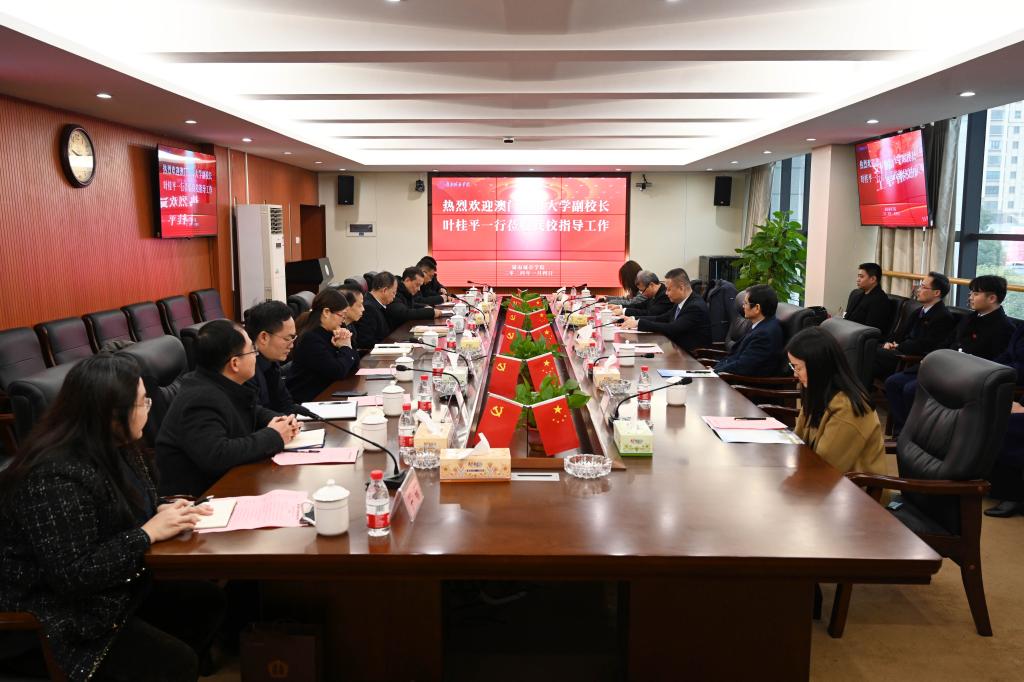 本网讯(通讯员 杜林远)新年伊始,1月4日,澳门城市大学副校长叶桂平率代表团访问众博官方网址,随团来访的有省教育考试院党委书记吴德平、省教育厅港澳台交流办公室主任周芳友、湖南秦希燕联合律师事务所主任秦希燕、澳门城市大学葡语国家研究院助理教授陈红和社会经济发展研究中心研究员刘思萱等。我校党委书记汤放华、校长何振、副校长雷存喜接待了代表团一行,双方在办公楼一会议室举行见面交流会。