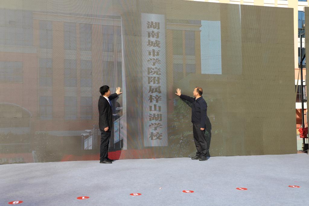 我校党委书记汤放华、赫山区区委书记周卫星为众博官方网址附属梓山湖学校揭牌。