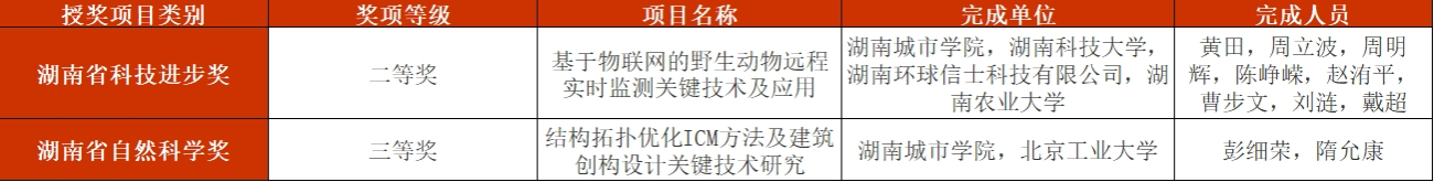 其中,我校信息与电子工程学院黄田副教授主持完成的基于物联网的野生动物远程实时监测关键技术及应用”项目获湖南省科技进步奖二等奖,土木工程学院彭细荣教授主持完成的“结构拓扑优化ICM方法及建筑创构设计关键技术研究”项目获湖南省自然科学奖三等奖。