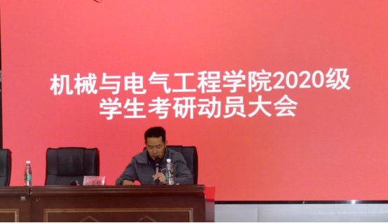 2023316日晚上730,机械与电气工程学院2020级学生考研动员大会在学生活动中心召开。参加会议的机械与电气工程学院党委书记张光富、党委副书记易志明、机电院副院长黄志亮、学工办主任、20级年级辅导员和2020级预备考研学生。本次会议由党委副书记易志明老师主持。