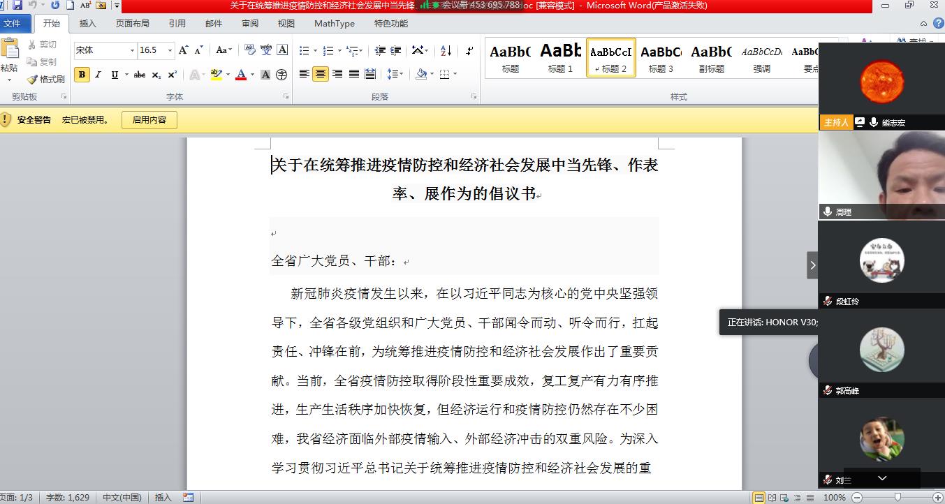 首先由支部书记周理同志领学了《学习“关于在统筹推进疫情防控和经济社会发展中当先锋、作表率、展作为的倡议书”》的文件精神,学习了中共湖南省委组织部关于在落实常态化疫情防控举措和全面推进复工复产的六条建议;然后由组织委员段虹伶同志带领大家一起学习了《深入学习习近平总书记关于统筹推进疫情防控和经济社会发展的重要讲话精神》的部分内容;宣传委员熊志宏同志带领大家一起学习了《众博官方网址党员教育管理办法》。学习完三个文件精神后,支部的党员同志开展了热烈的网上讨论。